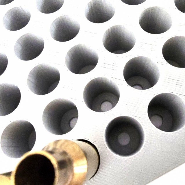 Solide brett i PLA plast, hull i bunnen for å få ut kruttsøl og beskytte tennehetter under lading.