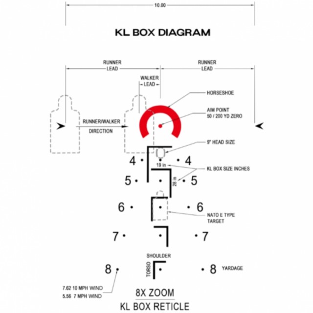 KL BOX (Known Length Box) retikkelet er tilpasset kjente mål og situasjoner, og gir mulighet for meget raske og presise skudd med BDC (Bullet Drop Compensation). I og med at dette siktet har SFP retikkel (Second Focal Plane) vil bullet drop compensation kun være korrekt på 6x forstørrelse