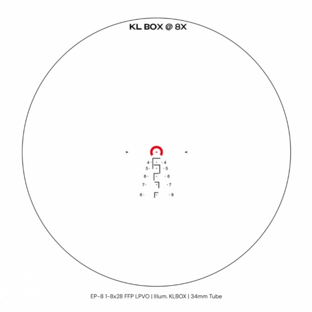 KL BOX (Known Length Box) retikkelet er tilpasset kjente mål og situasjoner, og gir mulighet for meget raske og presise skudd med BDC (Bullet Drop Compensation).